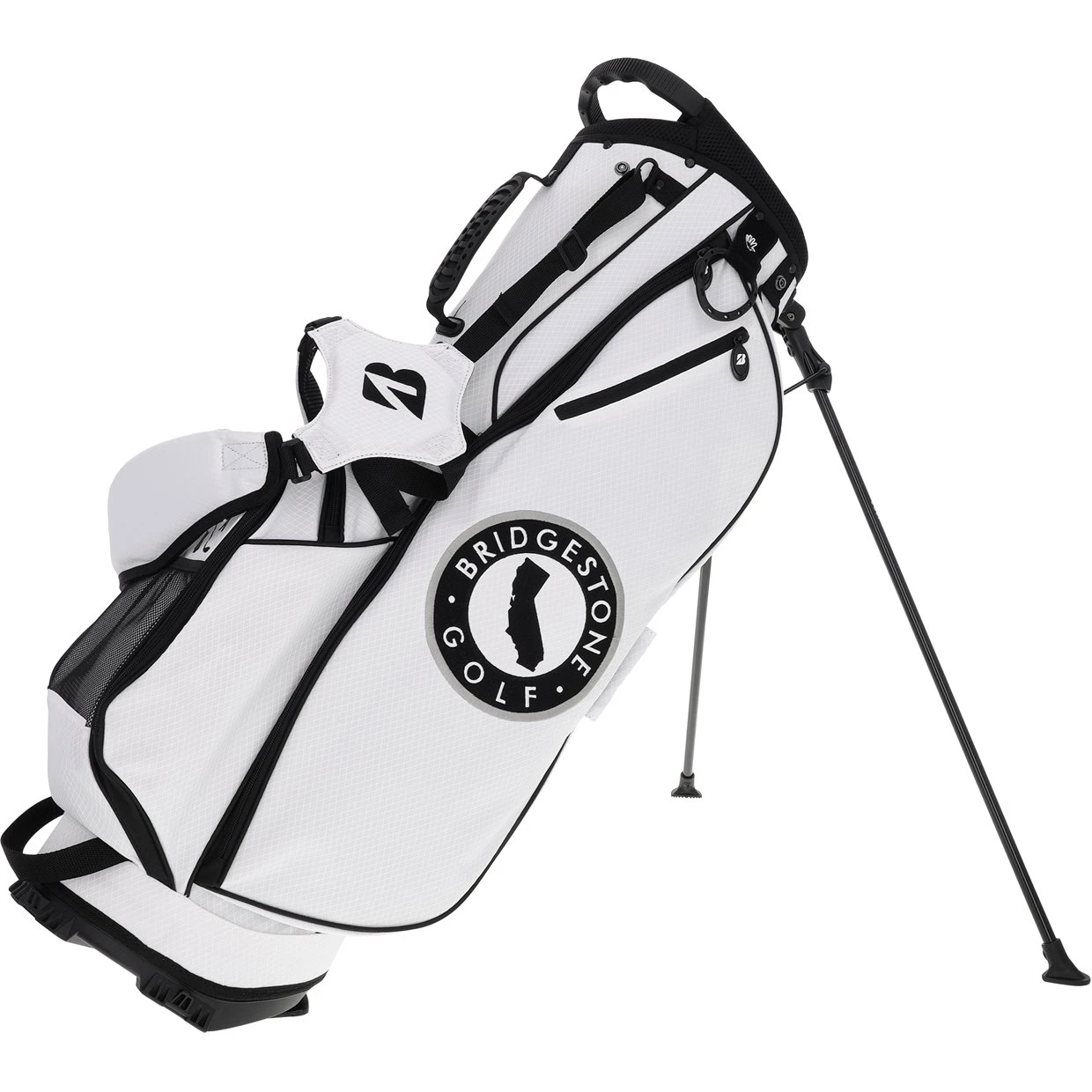 The State Collection Stand bag from Bridgestone features a 5-way divider top, 5 zippered pockets including a valuables pouch and an easy accessible cooler sleeve, and your state of choice Initials and Map Outline