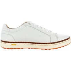The Albartross Croco shoe is sophisticated, casual, refined, and functional. It brings a modern street sneaker to the course for an exceptional golf experience. The embossed croc print upper is hand made with premium leather and stitched detailing. The contrasting sole features signature Albartross orange detailing. The Pro Golf outsole offers lightweight VIBRAM construction with excellent cushioning, stability, flexibility, durability, and traction. The insole supports natural motion with bio-mechanically designed comfort foam. Additional comfort features include a soft, breathable leather lining and extra padding at the ankle collar.